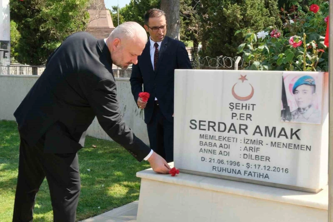 Menemen Kaymakamı Vedat Yılmaz ise konuşmasında, "15 Temmuz 2016 günü, Fetullahçı Terör Örgütü’nün habis ve kirli emellerini gerçekleştirmek için, seçilmiş hükümetimize ve gazi meclisimize karşı gerçekleştirdiği darbe girişimiyle karşı karşıya kalan Türkiye, milleti ve devletiyle omuz omuza verdiği direniş ve mücadeleyle tüm dünyaya örnek teşkil etmiştir. Türk demokrasisini hedef alan bu hain girişim, Türk halkının demokrasiyi ve seçilmiş iradeyi korumak için gösterdiği destansı direnişle geri püskürtülmüştür. Cumhurbaşkanımızın çağrısıyla sokağa dökülen Türk milletinin gösterdiği cesaret ve kararlılıkla elde edilen bu zafer, dünyada örneği olmayan bir ruh halini ve demokratik bilinci ortaya koymaktadır. 15 Temmuz’u unutmayacağız, unutturmayacağız" ifadelerini kullandı. Öğrenciler tarafından okunan şiirlerle devam eden tören, şehitlerin kabirlerine karanfil bırakılmasıyla sona erdi.