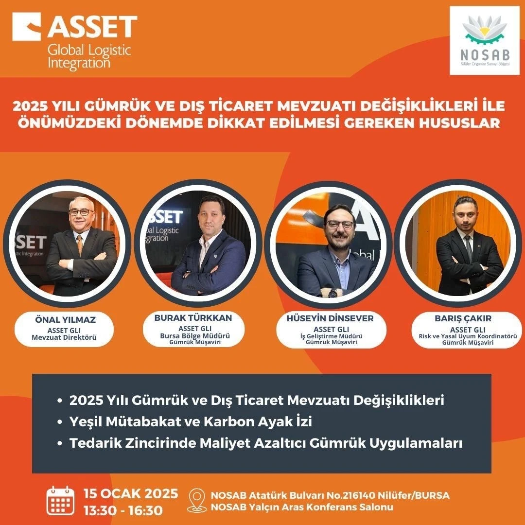 Asset Global Logistic Integration (GLI) ve NOSAB iş birliğiyle düzenlenen etkinlik, 15 Ocak Çarşamba günü, 13.30-16.30 saatleri arasında, NOSAB Yalçın Aras Konferans Salonu’nda gerçekleştirilecek. Konferansta, mevzuat değişikliklerinin yanı sıra yeşil mutabakat ve karbon ayak izi ile tedarik zincirinde maliyet azaltıcı gümrük uygulamaları masaya yatırılacak. Etkinlikte Asset GLI Mevzuat Direktörü Önal Yılmaz, Bursa Bölge Müdürü Burak Türkkan, İş Geliştirme Müdürü Hüseyin Dinsever ile Risk ve Yasal Uyum Koordinatörü Barış Çakır konuşmacı olarak yer alacak. Katılımcılar, güncel mevzuat değişiklikleri hakkında bilgi edinme fırsatı bulurken, dış ticaret ve lojistik süreçlerinde yeni stratejiler geliştirme imkanı yakalayacak.