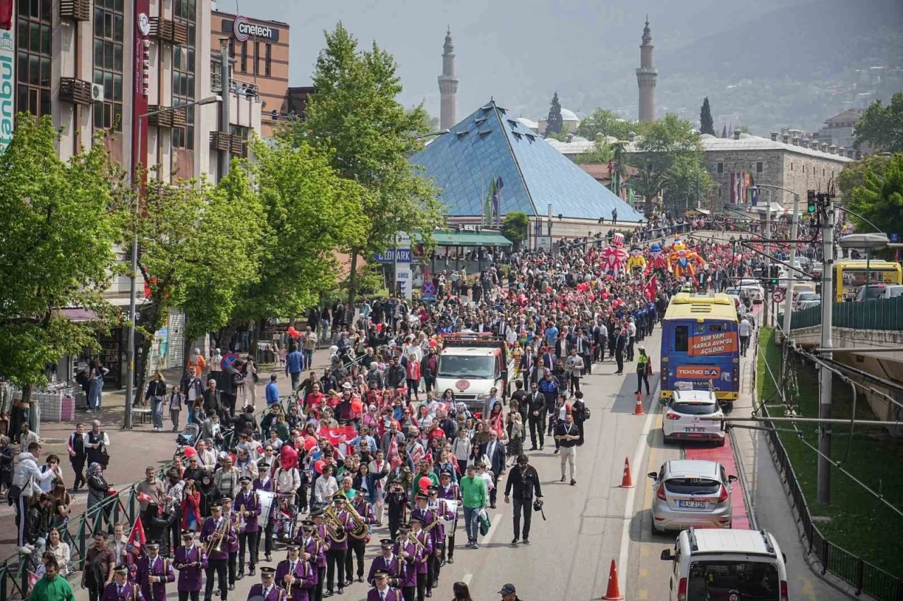 23 Nisan Ulusal Egemenlik ve Çocuk Bayramı tüm Türkiye’de olduğu gibi Bursa’da da büyük bir coşkuyla kutlandı. Bursa Büyükşehir Belediyesi tarafından ’Onların Gülüşü Hepimizin Yarını’ teması ile hazırlanan ’23 Nisan Çocuk Şenliği’nde çocuklar, dolu dolu program içeriğiyle unutulmaz bir gün geçirdi. 23 Nisan coşkusu, yüzlerce çocuk ve ailelerinin katılımıyla Altıparmak Caddesi’nden Merinos Parkı’na doğru yapılan kortej yürüyüşüyle başladı. Ellerindeki Türk bayraklarıyla marşlar söyleyerek ve şiirler okuyarak yürüyen çocuklara, Büyükşehir Belediye Başkanı Mustafa Bozbey ve eşi Seden Bozbey ve CHP İl Başkanı Nihat Yeşiltaş da eşlik etti.