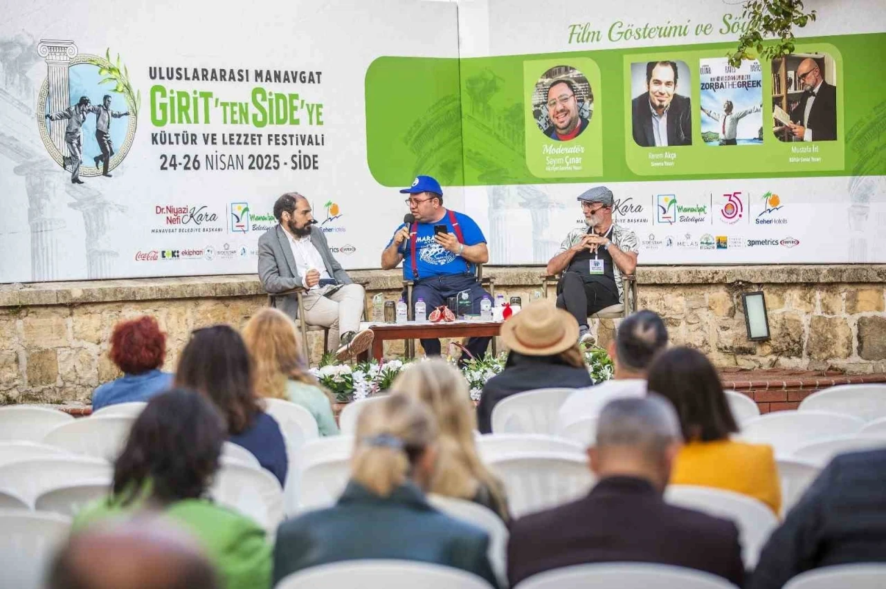 Zorba filminin özel gösteriminden sonra Hürriyet Gazetesi Yazarı ve Suare Dergi Yayın Danışmanı Sayım Çınar’ın moderatörlüğünde Sinema Yazarı Kerem Akça ve Kültür Sanat Yazarı Mustafa İri, Nikos Kazantzakis’in ölümsüz karakteri Zorba üzerinden hayata, özgürlüğe ve tutkulara dair derinlikli bir söyleşi gerçekleştirdi. Festivalin ev sahibi Manavgat Belediye Başkanı Dr. Niyazi Nefi Kara, hikâyesi Girit’te yaşanan ve Girit’te çekilen bir filmin Uluslararası Manavgat Girit’ten Side’ye Kültür ve Lezzet Festivali’nde gösterilmesinden büyük mutluluk duyduklarını belirtti. Bu filmin festival programına alınması fikrini veren Sayım Çınar’a, eserin verdiği mesajların Manavgatlı sinemaseverler tarafından daha iyi anlaşılması konusunda yorumlarda bulunan yazarlar Kerem Akça ve Mustafa İri’ye katkılarından dolayı teşekkür plaketi verdi.