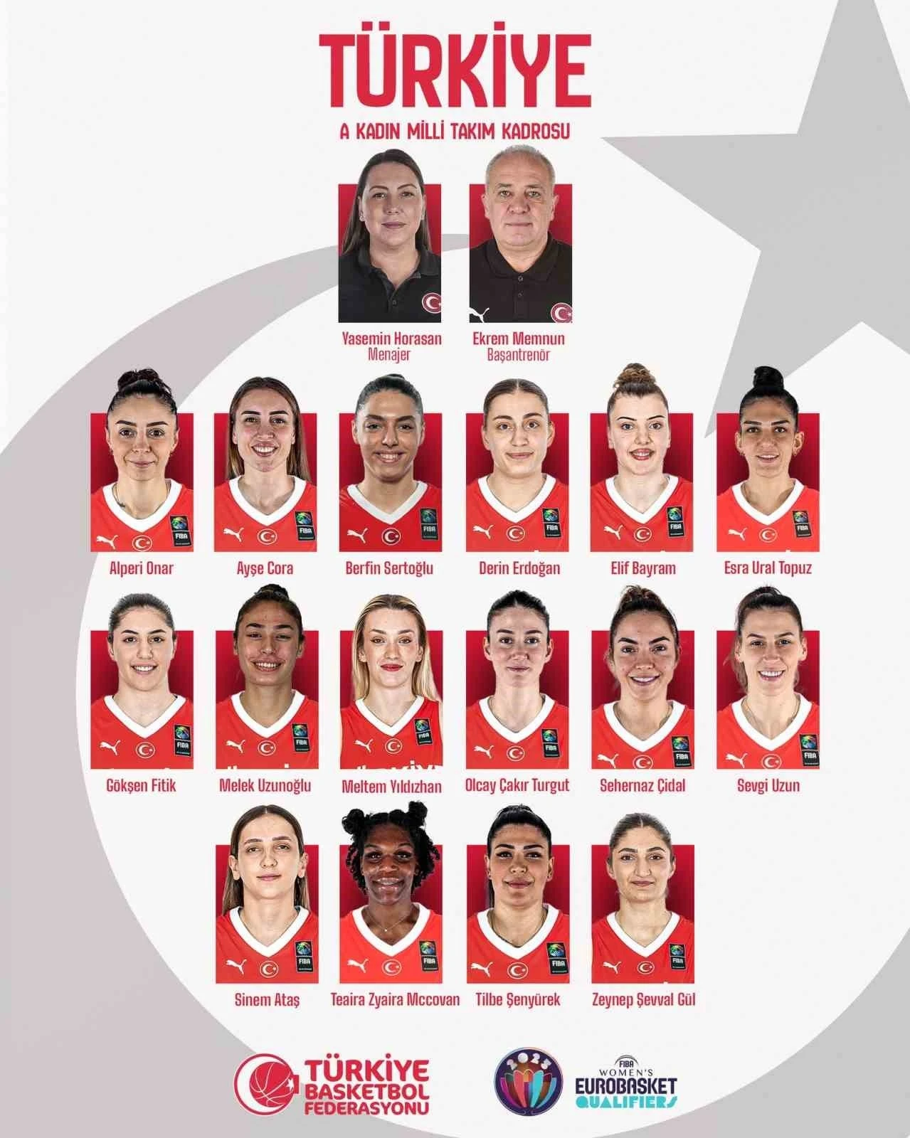 A Milli Kadın Basketbol Takımı’nın aday kadrosunda şu isimler yer alıyor: "Elif Bayram, Melek Uzunoğlu (Beşiktaş), Sinem Ataş (ÇBK Mersin), Sehernaz Çidal, Berfin Sertoğlu (Emlak Konut), Sevgi Uzun, Şerife Alper Onar, Tilbe Şenyürek, Olcay Çakır Turgut (Fenerbahçe Opet), Meltem Yıldızhan, Ayşe Cora, Gökşen Fitik, Derin Erdoğan (Galatasaray Çağdaş Faktoring), Zeynep Şevval Gül, Esra Ural Topuz (OGM Ormanspor), Teaira Zyaira McCovan."