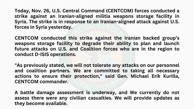 ABD Merkez Komutanlığı (CENTCOM), Suriye’de İran bağlantılı milislere ait bir silah deposuna yönelik saldırı gerçekleştirildiğini açıkladı.