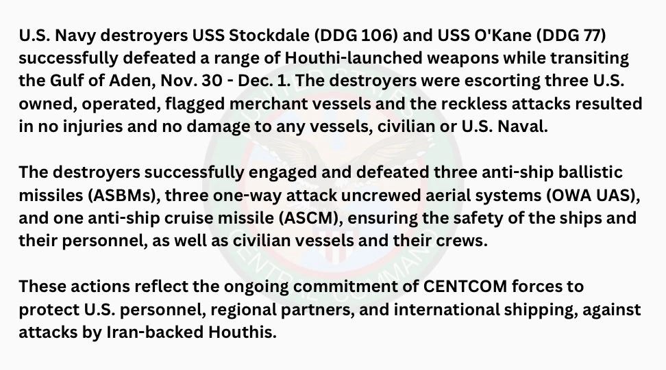 ABD Merkez Komutanlığı’ndan (CENTCOM), yapılan açıklamada, Aden Körfezi’nden geçen ABD gemilerine yönelik Husi saldırılarının başarıyla etkisiz hale getirildiği belirtilerek, “Saldırılarda hiçbir yaralanma ya da sivil kayıp yaşanmamış, ABD donanmasına ait hiçbir gemide hasar meydana gelmemiştir” denildi.