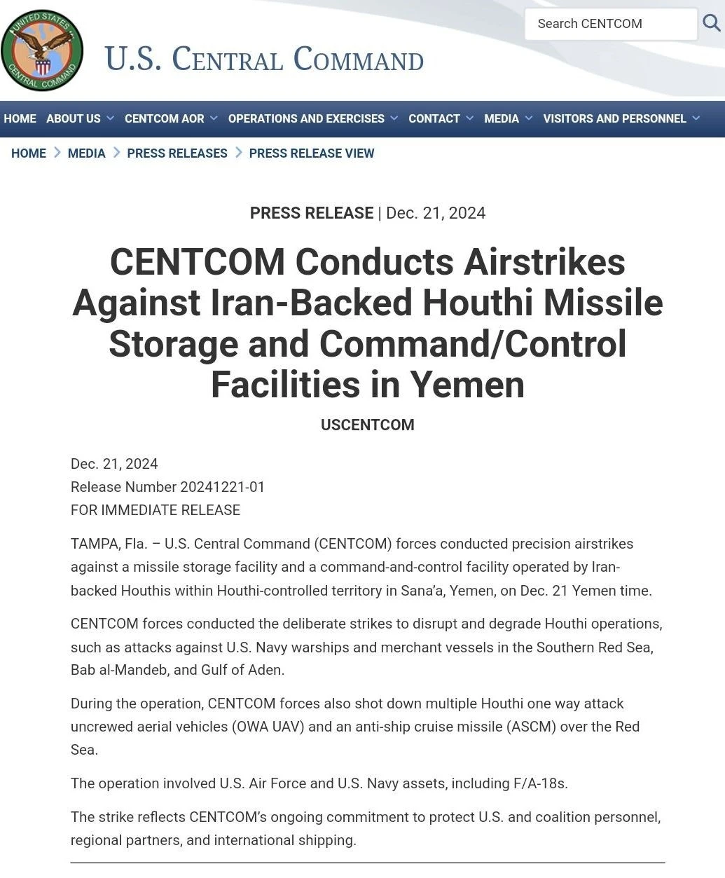 “CENTCOM Kuvvetleri, ayrıca Kızıldeniz üzerinde Husilere ait çok sayıda tek yönlü saldırı dronunu (OWA UAV) ve bir gemisavar seyir füzesini (ASCM) düşürmüştür” denilen açıklamada, “Operasyonda F/A-18 savaş uçakları da dahil ABD Hava Kuvvetleri unsurları ile ABD Deniz Kuvvetleri unsurları yer almıştır” ifadeleri kullanıldı. CENTCOM’un Güney Kızıldeniz, Bab el-Mendeb ve Aden Körfezi’ndeki ABD gemilerine yönelik saldırılar gibi Husi saldırılarını etkisiz hale getirmek için planlı operasyonlar gerçekleştirdiği hatırlatılan açıklamada, “Son saldırı, CENTCOM’un ABD ve koalisyon personelini, bölgesel ortaklarını ve uluslararası deniz taşımacılığını korumaya yönelik süregelen kararlılığını yansıtmaktadır” denildi.