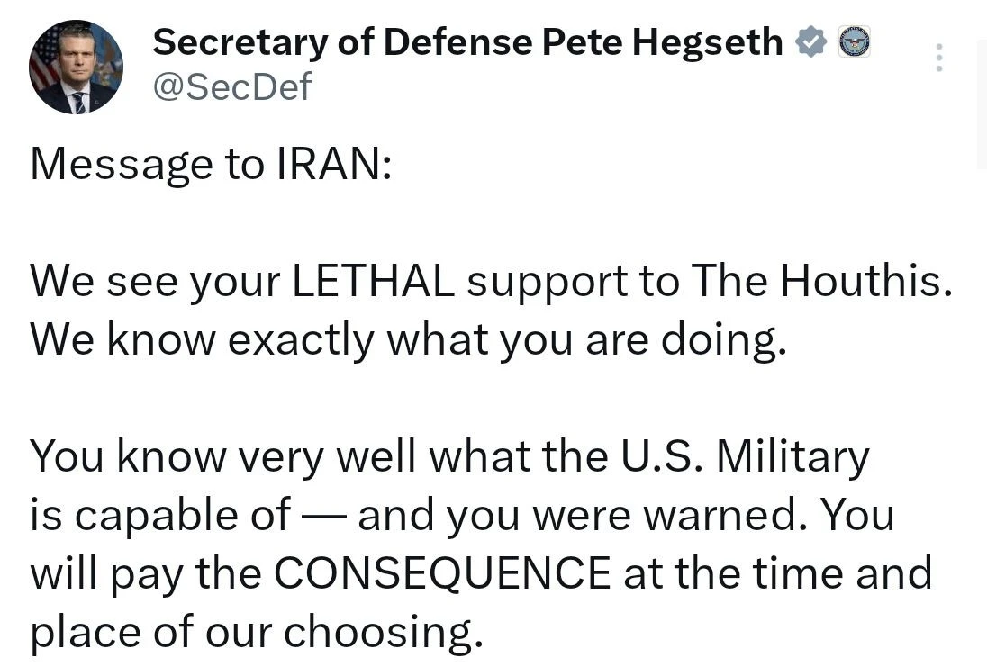 ABD Savunma Bakanı Pete Hegseth, İran’ın Yemen’deki Husilere verdiği desteğin cezasız kalmayacağını belirterek, "Sonuçlarına, bizim seçeceğimiz zaman ve yerde katlanacaksınız" uyarısında bulundu.