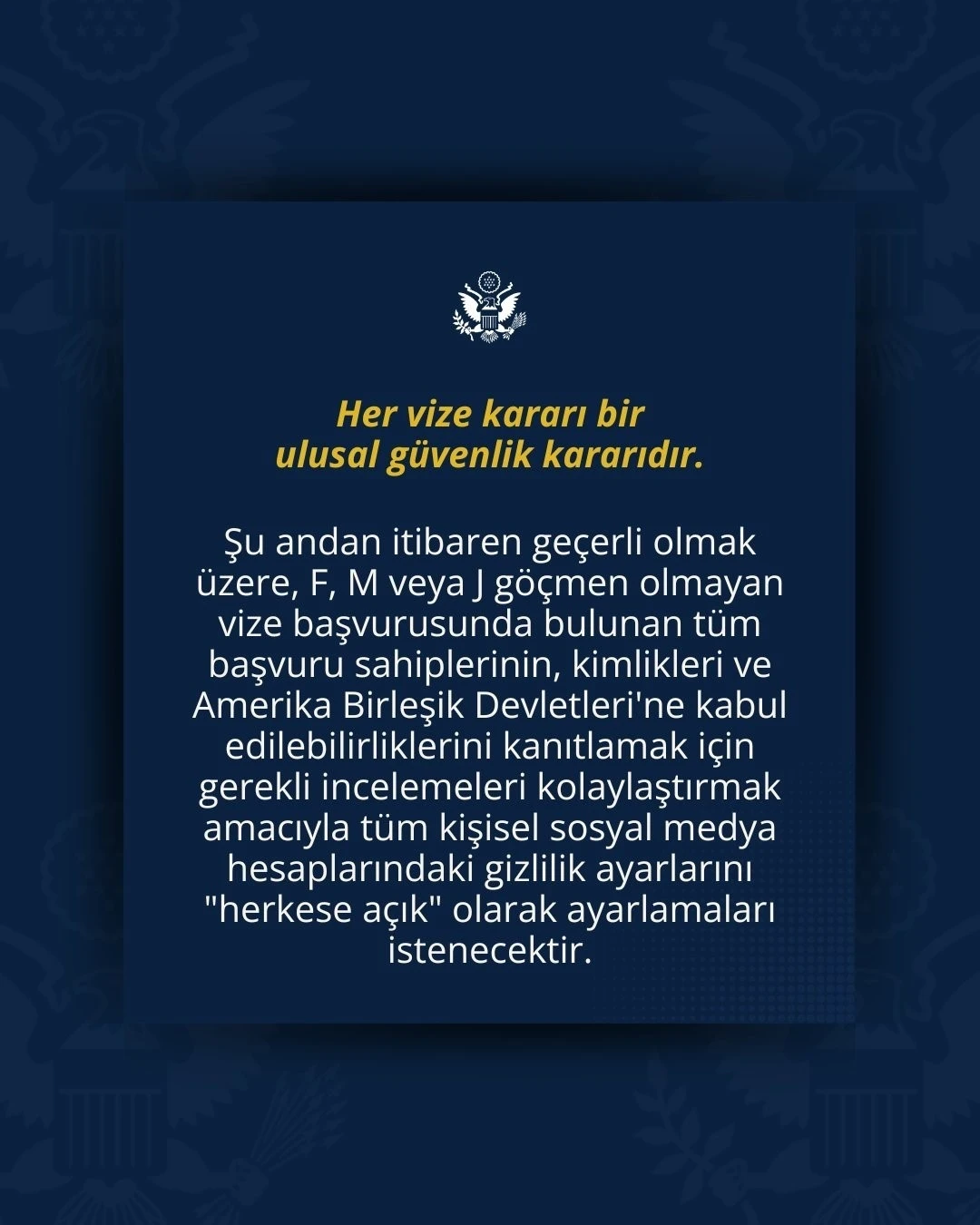 "Şu andan itibaren geçerli olmak üzere, F, M veya J göçmen olmayan vize başvurusunda bulunan tüm başvuru sahiplerinin, kimlikleri ve Amerika Birleşik Devletleri’ne kabul edilebilirliklerini kanıtlamak için gerekli incelemeleri kolaylaştırmak amacıyla tüm kişisel sosyal medya hesaplarındaki gizlilik ayarlarını ‘herkese açık’ olarak ayarlamaları istenecektir."