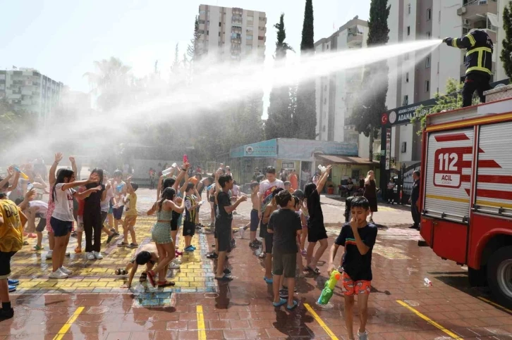 Adana Büyükşehir Belediyesi İtfaiye Ekipleri, karne heyecanı yaşayan çocukların sevincine ortak oldu, sıcaktan bunalan miniklere serinleten sürpriz yaptı.