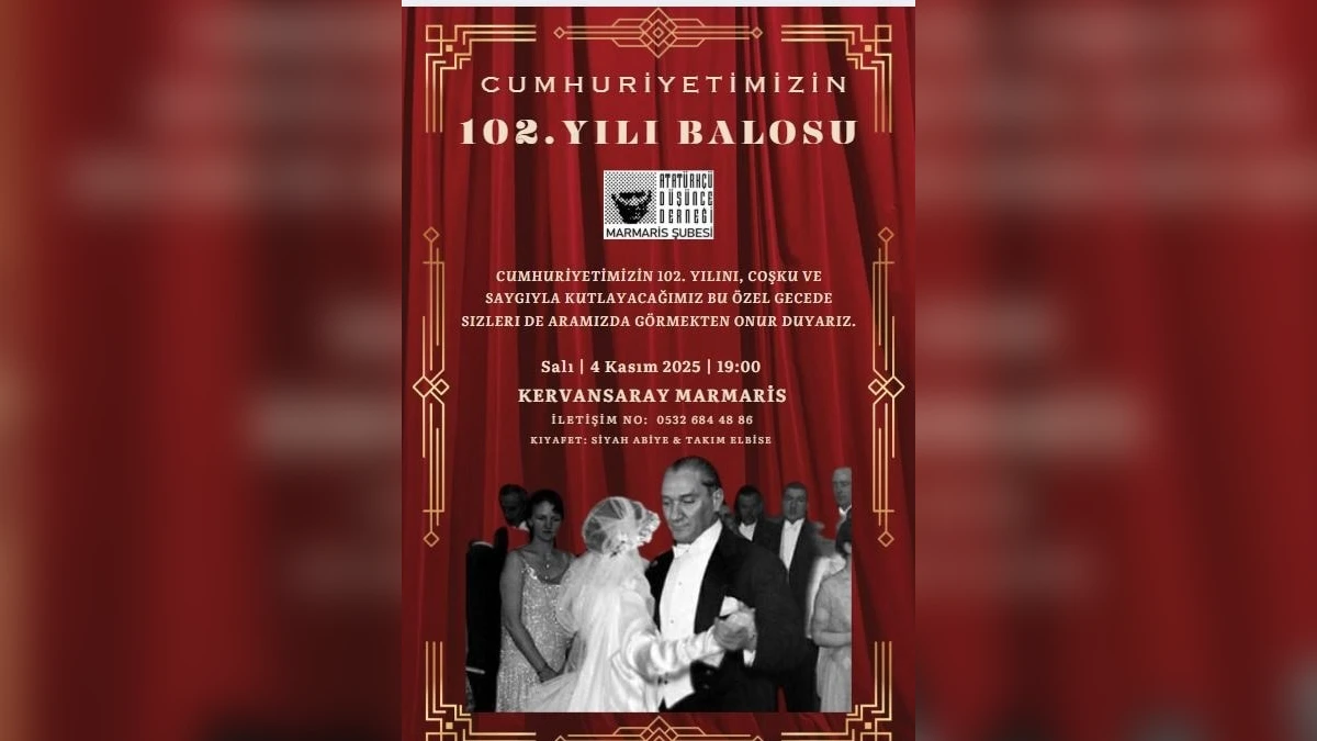 Türkiye Cumhuriyeti'nin kuruluşunun 102. yıl dönümü, Marmaris'te anlamlı ve coşkulu bir etkinlikle taçlanacak. Atatürkçü Düşünce Derneği (ADD) Marmaris Şubesi, geleneksel Cumhuriyet Balosu'nu bu yıl 4 Kasım 2025 Salı günü Kervansaray Marmaris'te gerçekleştirecek.