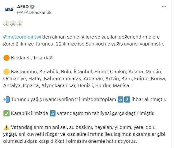 Paylaşımda, turuncu yağış uyarısı verilen 2 ilden 57 ihbar alındığı ve Karabük’te 5 kişinin tahliye edildiği belirtilerek, "Vatandaşlarımızın ani sel, su baskını, heyelan, yıldırım, yerel dolu yağışı, ani kuvvetli rüzgar ve kısa süreli fırtına ile ulaşımda aksamalar gibi olumsuzluklara karşı dikkatli olmasını önemle hatırlatıyoruz" ifadelerine yer verildi.