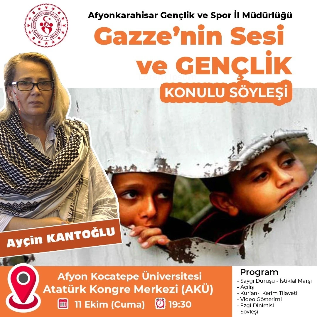Afyonkarahisar Gençlik ve Spor İl Müdürlüğü tarafından düzenlenen “Gazze’nin Sesi ve Gençlik” konulu söyleşi gerçekleştirilecek.