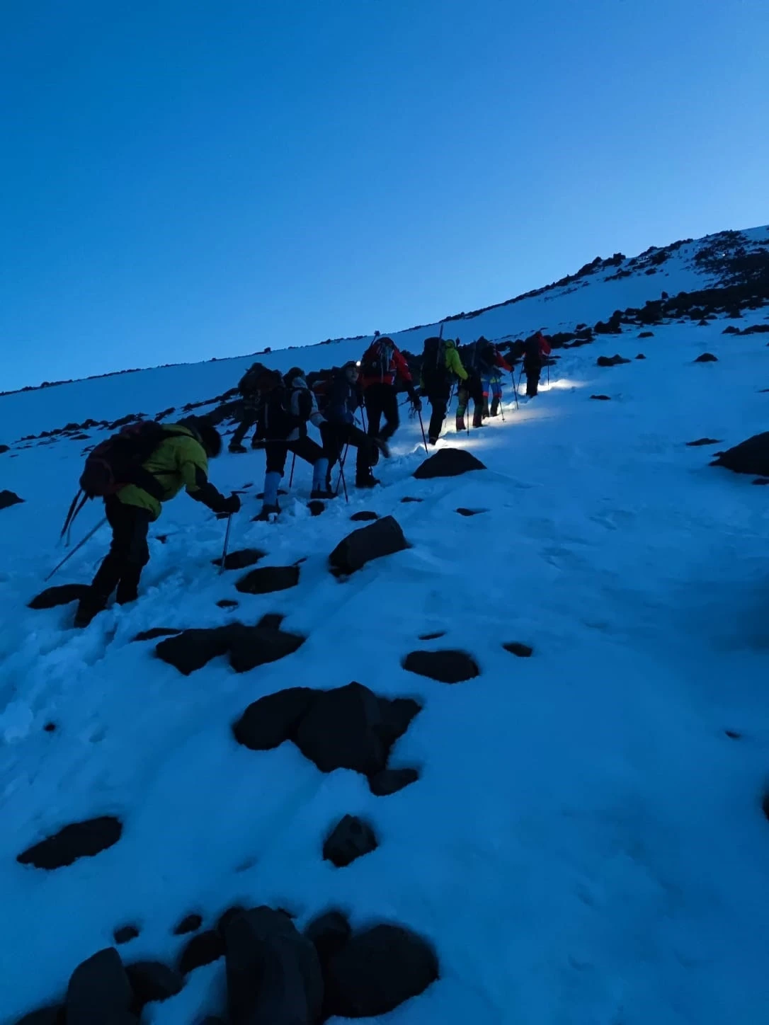 Tırmanış, yerel rehber Cuma Saltık öncülüğünde başladı. Dağcıların karla kaplı zorlu araziye rağmen yürüyüşlerini sürdürdüğü görüldü.