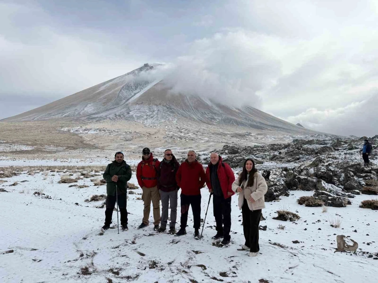 Tırmanış, yerel rehber Cuma Saltık öncülüğünde başladı. Dağcıların karla kaplı zorlu araziye rağmen yürüyüşlerini sürdürdüğü görüldü.