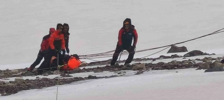 Ağrı Dağı’na yaptığı zirve tırmanışının ardından donarak hayatını kaybeden iki dağcının cesetleri zor şartlar altında 4 bin 200 rakımdaki kampa taşınıyor.