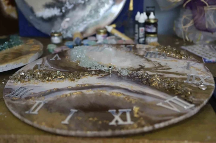 Amaçlarının ev hanımlarının sosyal hayatlarına destek vermek olduğunu belirten Epoksi sanatı usta öğretici Ülküye Gengörü, “Şu anki modülüm epoksi ve reçine üzerine, objeler yapılıyor, tablolar, saatler yapılıyor. Hanımlara yönelik ve meslek edinme kursu, bu kursa gelen arkadaşlar hem meslek ediniyor, çok güzel kazançlar sağlanıyor. Yaptığımız epoksi malzemeleri de epoksi, renkli boyalar, doğadan aldığımız bazı çiçekler, onları kullanıyoruz. Aynı zamanda cam kırıkları kullanıyoruz doğal cam kırıkları bunlar, sanayiden getiriyoruz çünkü bunları piyasadan almak son derece pahalı, pahalı olduğu için bizde sanayide arabaların veya vitrin camları kırıldığı zaman bunları geri dönüşüm olarak tekrardan biz buraya getirip değerlendirip objelerde veya saat, panolarda kullanıyoruz. Yani maliyeti en aza indirmeye çalışıyoruz. Bayanlar bu işi çok severek yapıyor, potansiyeli çok yüksek, aynı zamanda çok güzel kazançlar elde ediyorlar çünkü yapımı çok kolay, dediğim gibi doğal taşlar kullanılıyor yada doğadan toplanan çiçekler kullanılıyor” ifadelerini kullandı.