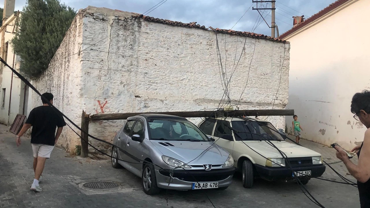 Muğla’nın Menteşe ilçesi Emirbeyazıt Mahallesi Üçler Sokak’ta ahşap telefon direği henüz bilinmeyen bir nedenle kırılarak park halindeki iki aracın üzerine düştü. Direğin devrilmesiyle birlikte telefon ve internet kabloları da yere saçıldı.