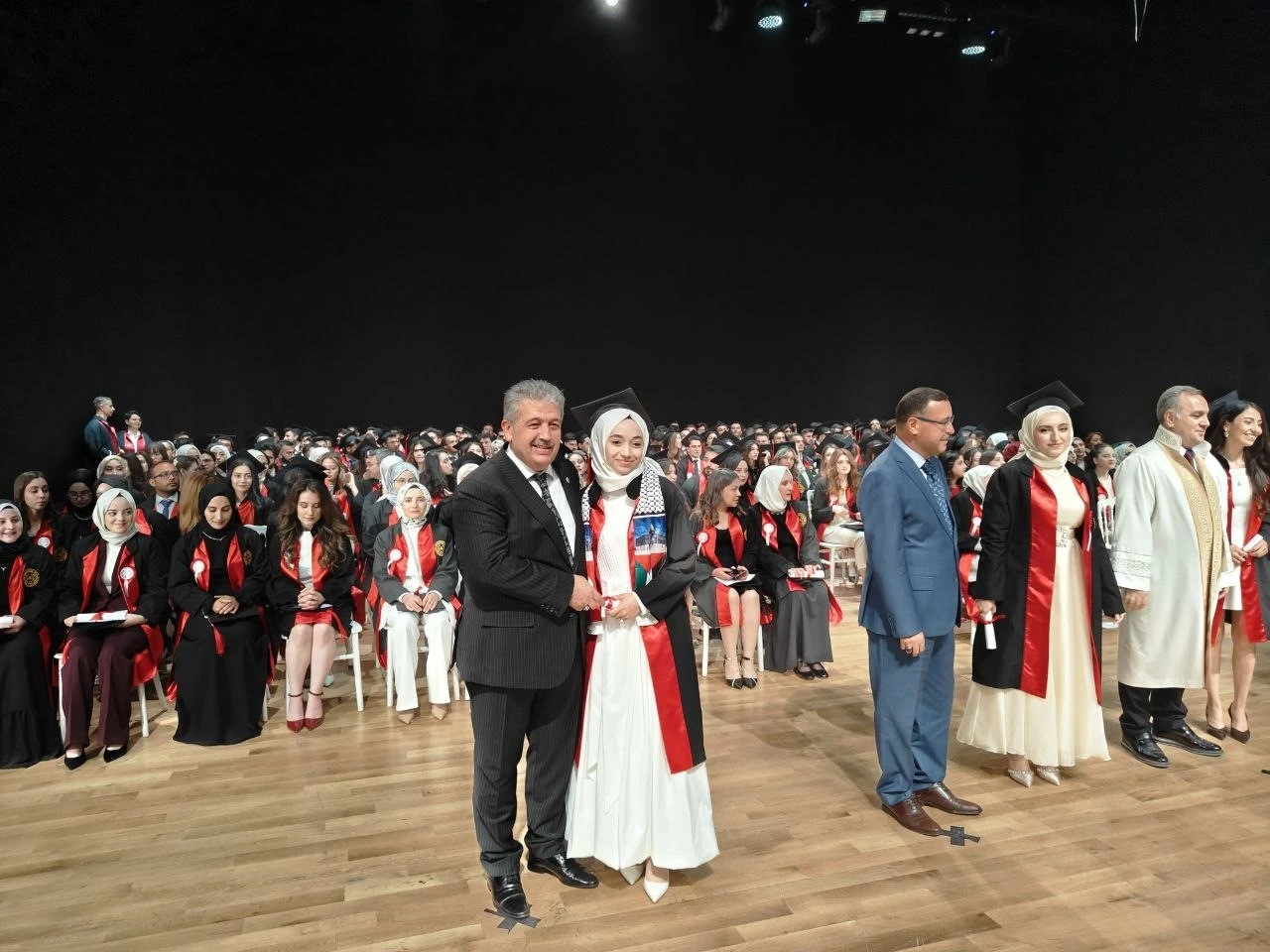 Daha sonra fakülteden mezun olan Ravzagül Özsoy, babası AK Parti Kayseri Milletvekili Özsoy’un elini öperek diplomasını aldı.