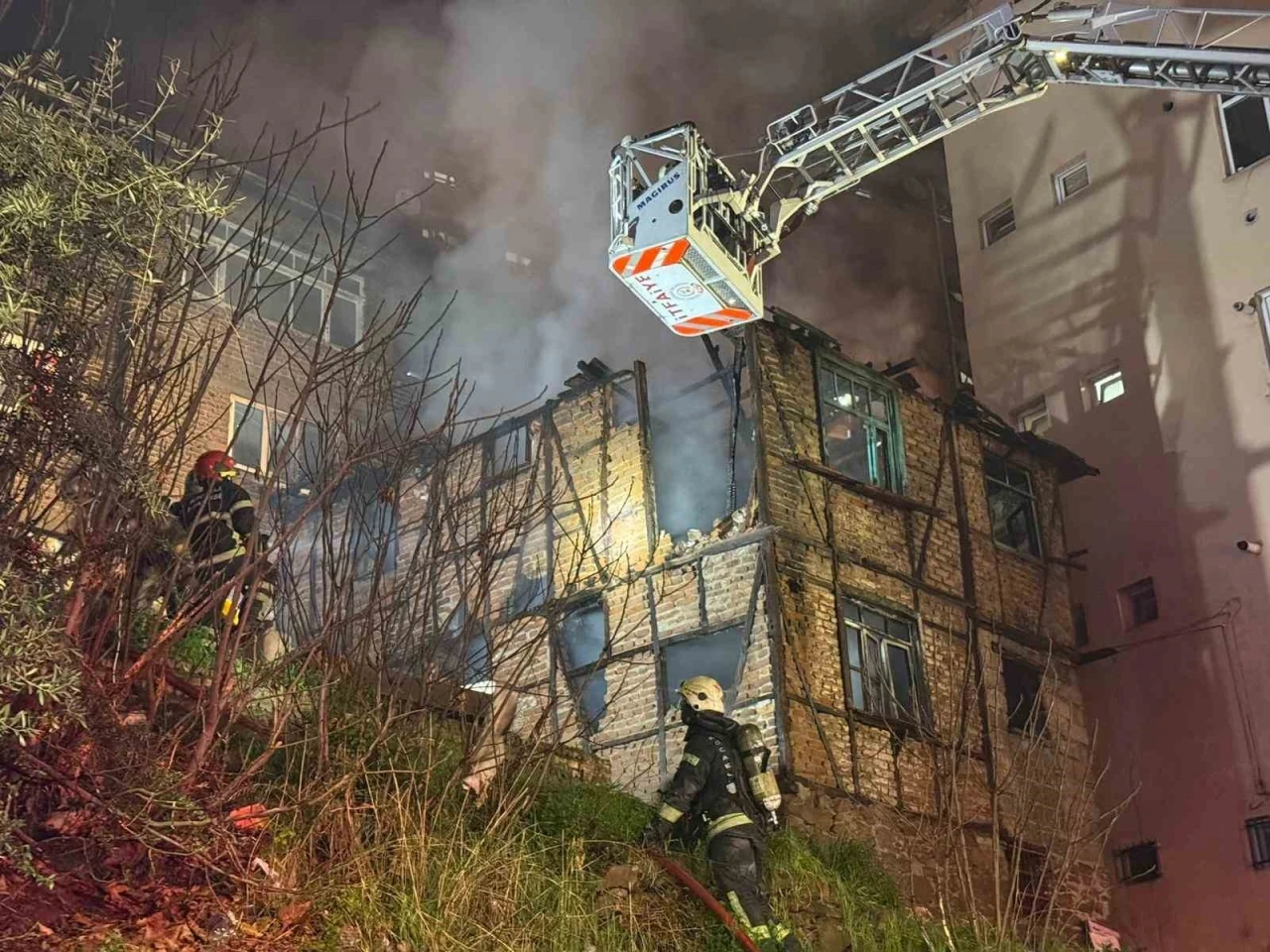 Kadıköy Mahallesi Turan Güneş Caddesi’ndeki 2 katlı ahşap metruk binada henüz bilinmeyen nedenle yangın çıktı. Gökyüzünü aydınlatan alevleri fark edenlerin 112 Acil Çağrı Merkezi’ne ihbarı üzerine adrese çok sayıda itfaiye, sağlık ve polis ekibi sevk edildi. İtfaiyenin çalışmasıyla yangın söndürülürken, ahşap bina küle döndü. Binanın bitişiğindeki 3 katlı bir başka binanın içerisine dolan duman tahliye edilirken, tedbir amaçlı olarak boşaltıldı. Öte yandan yanan ahşap binanın tuğlalarını kırarak içerisine giren itfaiye ekipleri, içeride biri olup olmadığını kontrol etti ve soğutma çalışması gerçekleştirdi.