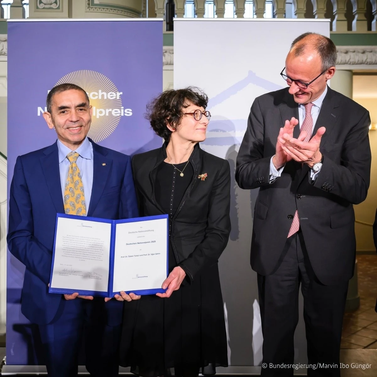 Korona virüs salgınıyla mücadelede geliştirdikleri aşı ile büyük katkı sağlayan Özlem Türeci ve Uğur Şahin, 2025 yılı Alman Ulusal Ödülü’ne layık görüldü. Türeci ve Şahin’e verilen ödüller için Berlin’de tören düzenlendi. Törene, Almanya Başbakanı Friedrich Merz ile çok sayıda davetli katıldı. Törende toplam değeri 50 bin euro olan ödül Türeci ve Şahin’e verildi.