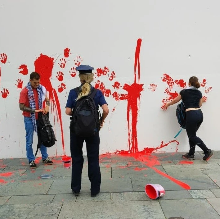 Filistin destekçisi 2 kişi, öğle saatlerinde Almanya’nın başkenti Berlin’de İsrail ve Almanya’yı protesto etti. Yakın zamanda isimlerini değiştiren Neue Generation (Yeni Nesil) adlı grubun üyesi 2 kişi, ellerini yanlarında getirdikleri kırmızı boyaya bulayarak Almanya Başbakanlığı binasının duvarına sürdü. Sosyal medya hesaplarından da eylemlerini paylaşan göstericiler, "İsrail’in 2’nci en büyük tedarikçisi Almanya, Gazze’deki acılardan doğrudan sorumludur" ifadelerini kullandı.