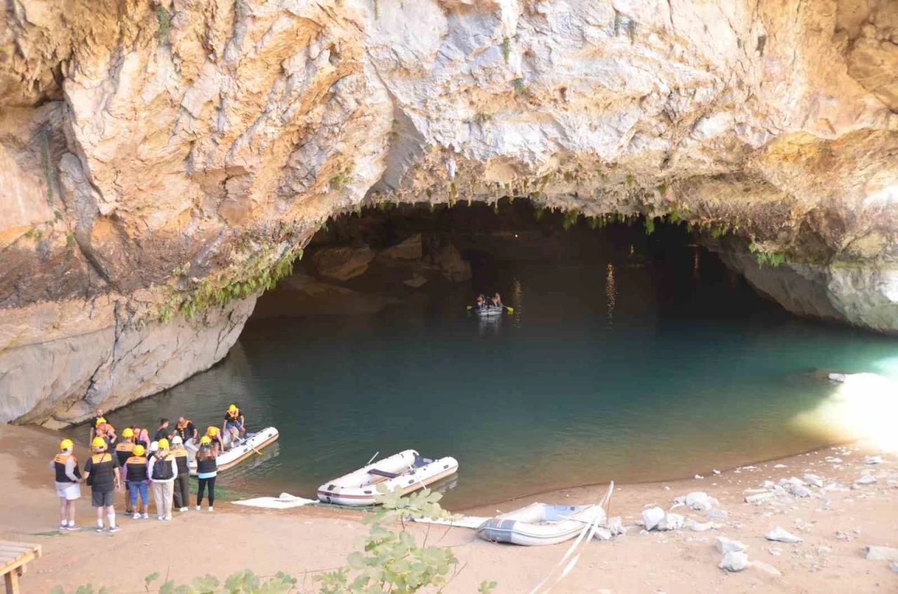 Turkuaz renkteki suyun üzerinde gezi botları ile Altınbeşik Mağarası’nın güzelliklerini keşfe çıkan yerli ve yabancı ziyaretçiler, Antalya’nın bu cennet köşesine hayran kalıyor. Büyük ilgi görüyor