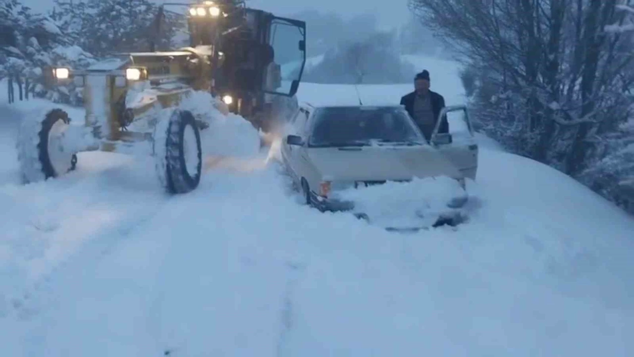 Amasya’da karla kaplı köy yolunda araçlarıyla mahsur kalan aileyi, yakıtları bitmek üzereyken Amasya İl Özel İdaresi greyder operatörleri kurtardı.