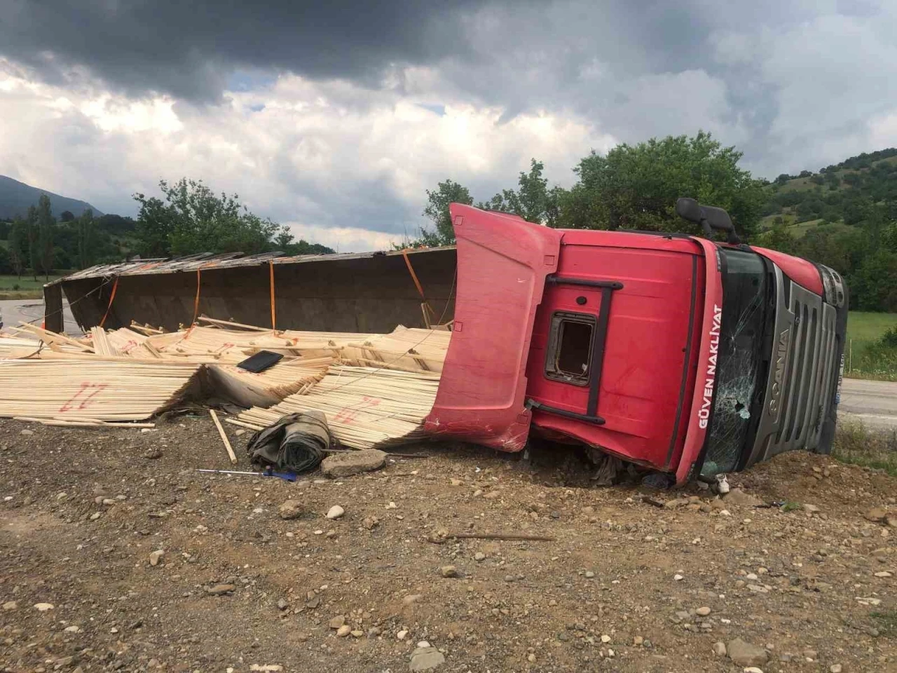 Amasya’nın Taşova ilçesinde kereste yüklü tırın devrildiği kazada 2 kişi yaralandı.