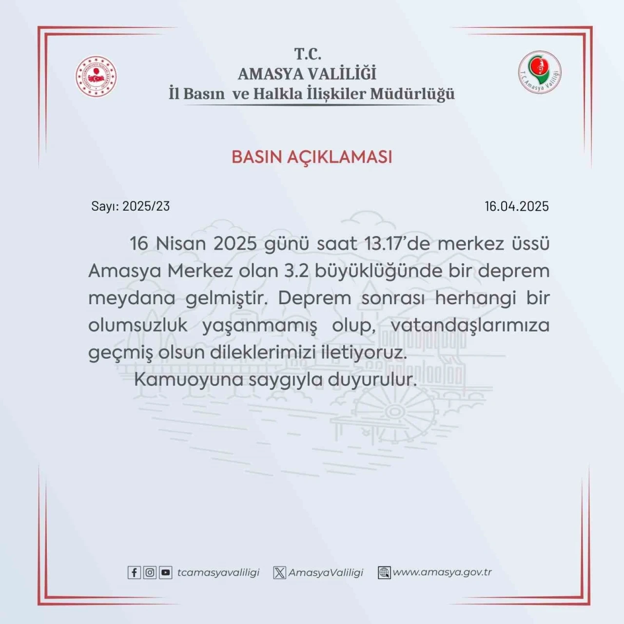 Valilikten yapılan açıklamada, "16 Nisan 2025 günü saat 13.17’de merkez üssü Amasya Merkez olan 3.2 büyüklüğünde bir deprem meydana gelmiştir. Deprem sonrası herhangi bir olumsuzluk yaşanmamış olup, vatandaşlarımıza geçmiş olsun dileklerimizi iletiyoruz" denildi.