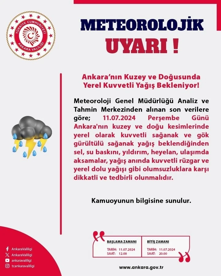 “Meteoroloji Genel Müdürlüğü Analiz ve Tahmin Merkezinden alınan bilgilere göre Ankara’nın kuzey ve doğu kesimlerinde yerel olarak kuvvetli sağanak ve gök gürültülü sağanak yağış beklendiğinden sel, su baskını, yıldırım, heyelan, ulaşımda aksamalar, yağış anında kuvvetli rüzgar ve yerel dolu yağışı gibi olumsuzluklara karşı dikkatli ve tedbirli olunmalıdır.”