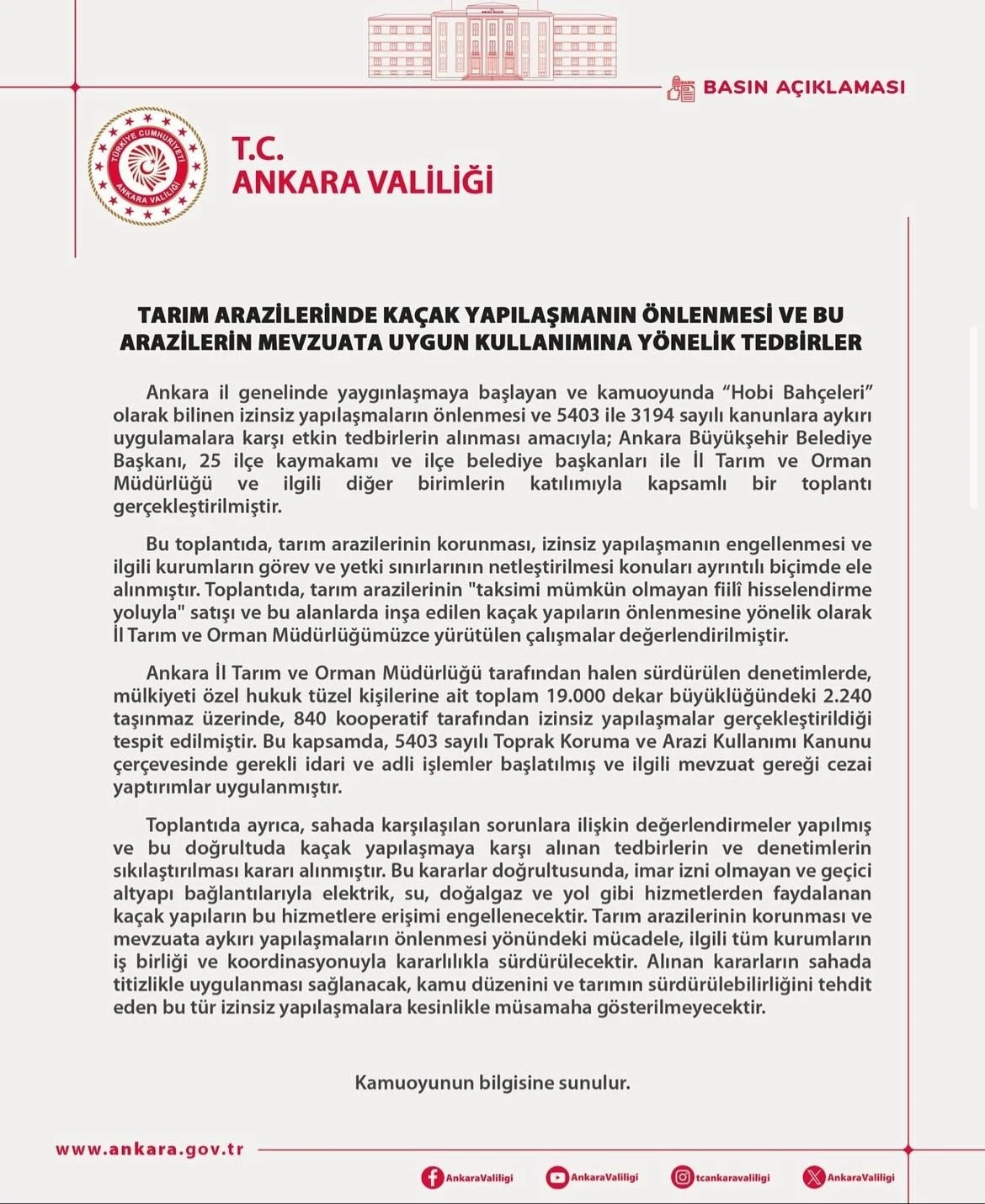 Ankara Valiliği tarafından Ankara il genelinde yaygınlaşmaya başlayan ve kamuoyunda ‘Hobi Bahçeleri’ olarak bilinen izinsiz yapılaşmaların önlenmesi ve 5403 ile 3194 sayılı kanunlara aykırı uygulamalara karşı etkin tedbirlerin alınması amacıyla şu ifadelere yer verildi: