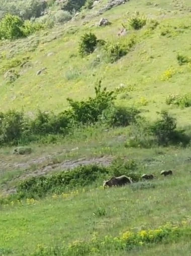Posof’a bağlı Kaleönü köyü arazisinde nesli tükenme tehdidi altında olan boz ayı, yavrularıyla birlikte ilerlerken görüntülendi. Anne ayının 2 yavrusuyla doğada yiyecek aradığı anlar cep telefonu kamerası ile kayıt altına alındı. Görüntülerde, yavru ayıların annelerinin yanından hiç ayrılmaması dikkat çekti.