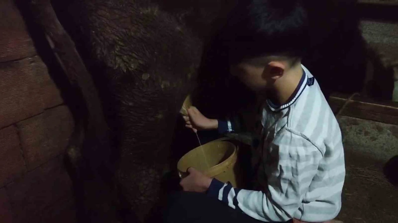 Annesine yardımcı olmak için girdiği ahırda ineklerin tüm işlerini hallettiğini dile getiren Umut Muhammet Kus “Annem kazadan dolayı ineğe bakamıyor, o nedenle bende ona yardımcı oluyorum. Her gün ineği sağıyorum” ifadelerini kullandı.