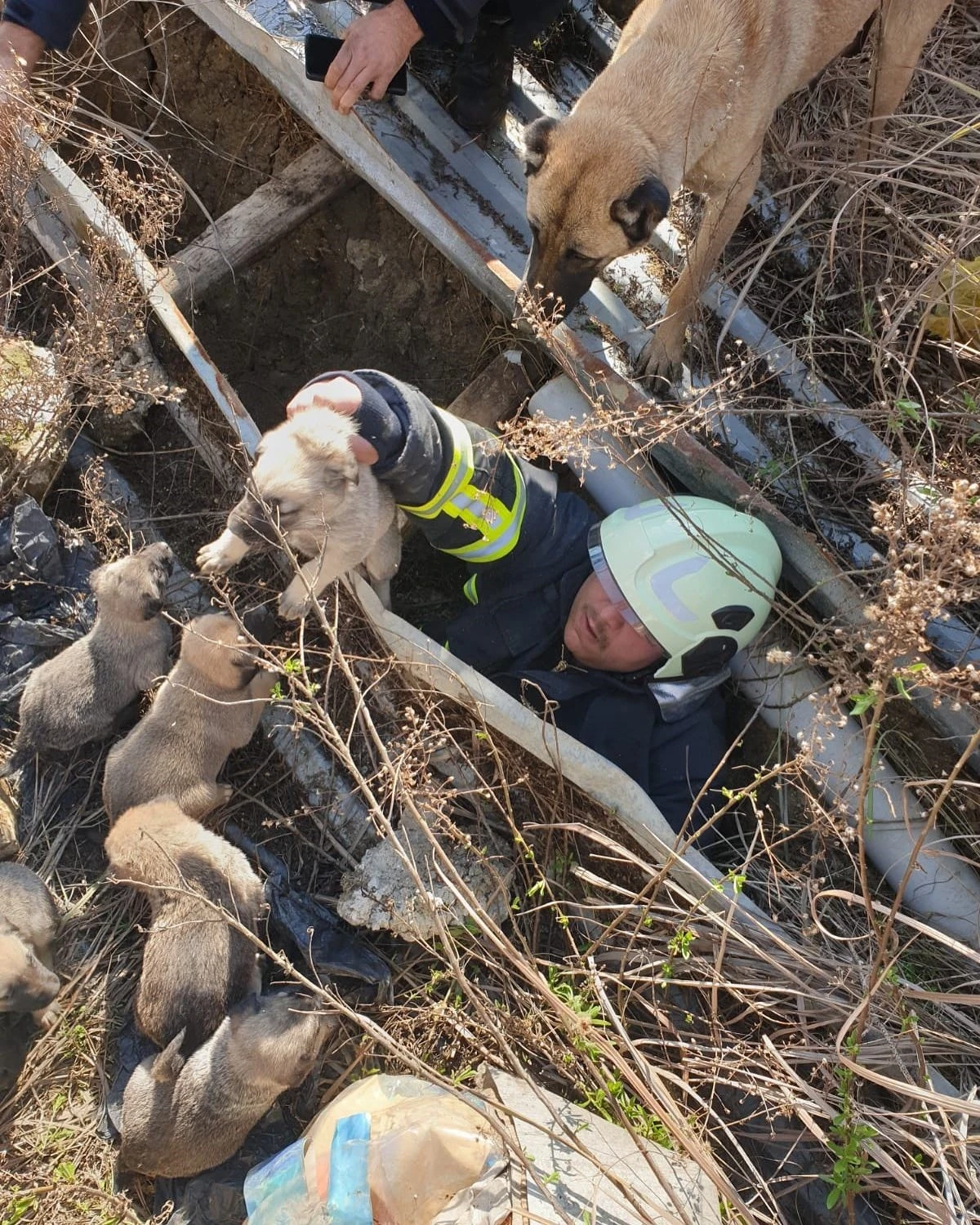 Antakya ilçesi Günyazı Mahallesi’nde inşaat içerisinde bulunan çukura düşen yavru köpekleri fark eden vatandaşlar durumu itfaiye ekiplerine bildirdi. İhbar üzerine bölgeye itfaiye ekipleri intikal etti. Yavru köpekler, itfaiye ekipleri tarafından zarar görmeden kısa sürede kurtarıldı. Kurtarılma esnasında yavrularının başından ayrılmayan anne köpek ve yavruları güvenli bir alana alındı.