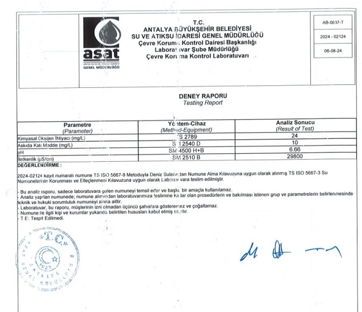 Yapılan müdahale ile birlikte, tesis çıkış sularının limit değerlerin altına indiği ekte bulunan numune sonuçları ile tespit edilmiştir. Ayrıca, tesisin normal çalışma standartlarına döndüğü Antalya Çevre, Şehircilik ve İklim değişikliği İl Müdürlüğü tarafından alınan numuneler ile teyit edilmiştir.