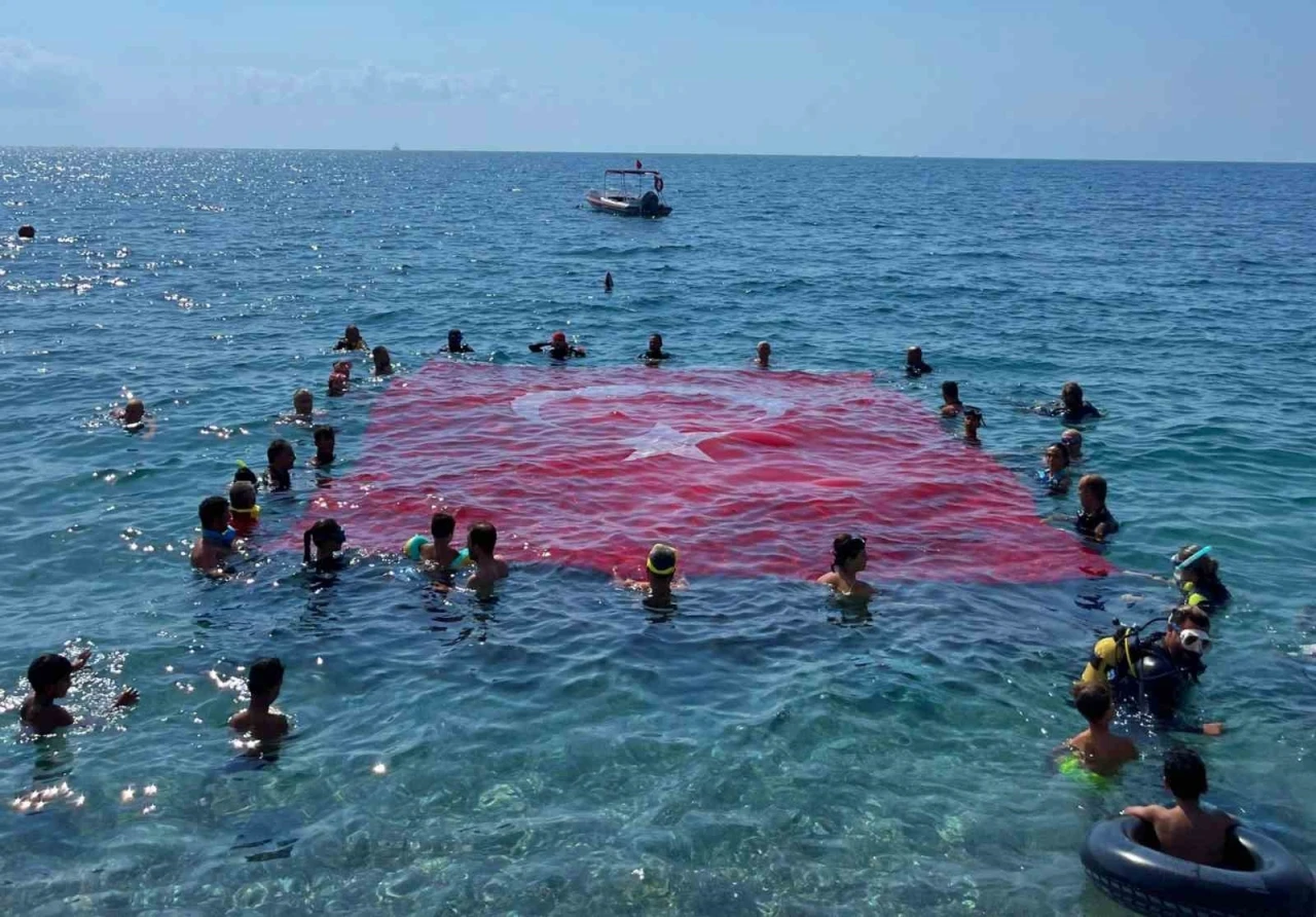 30 Ağustos Zafer Bayramı kutlamaları çerçevesinde yüzücü ve dalgıçlar tarafından denizde dev Türk Bayrağı açıldı.
