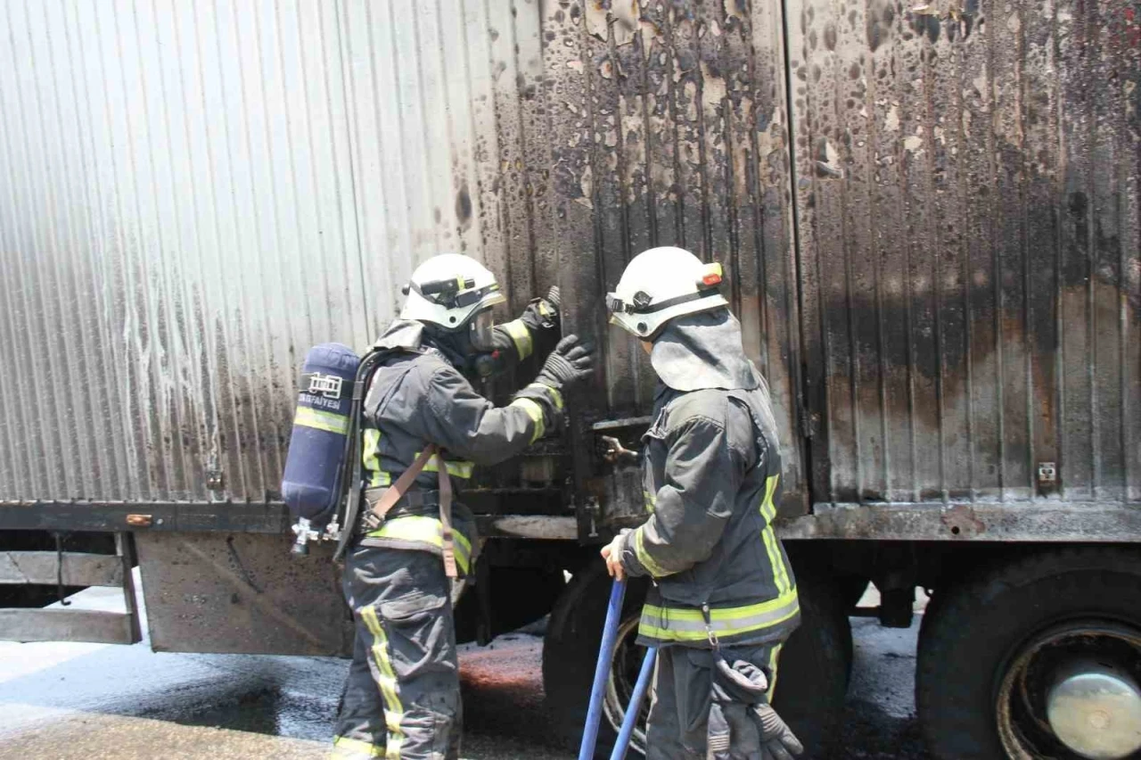 Antalya’nın Serik ilçesinde park halindeyken çıkan yangında kapalı kasa bir kamyon alev alev yandı. Sürücüsünün son anda fark ettiği yangın, itfaiyenin müdahalesiyle söndürüldü.