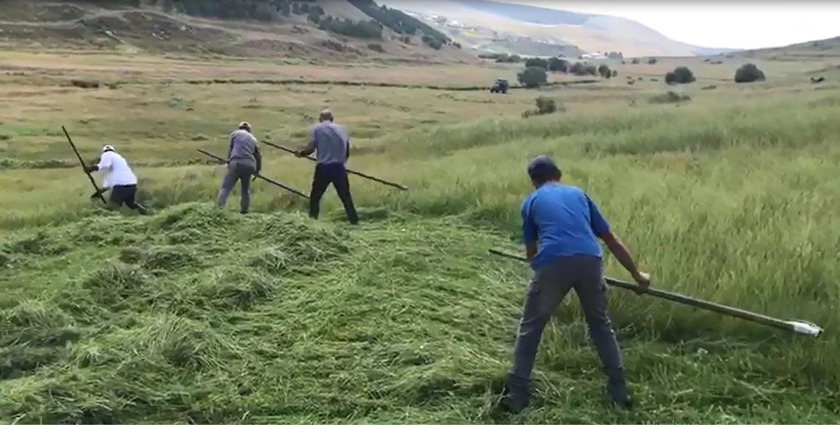 Ardahan’ın dağlık köylerinde çiftçilik yapanlar, biçerdöverin giremediği yüksek kesimlerdeki meralarda otları atadan kalma yöntem olan tırpanlarla biçerek hayvanları için kışlık yem hazırlıyor.