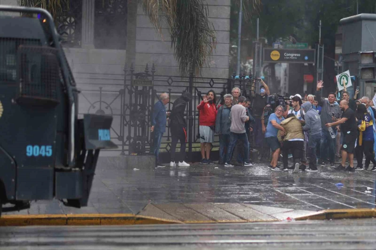 Polis, ellerinde bayraklarla, emeklileri destekleyen tezahüratlar yaparak Kongre binasına doğru ilerleyen kalabalık Boca Juniors taraftarını engellemek için kordon oluşturdu.
