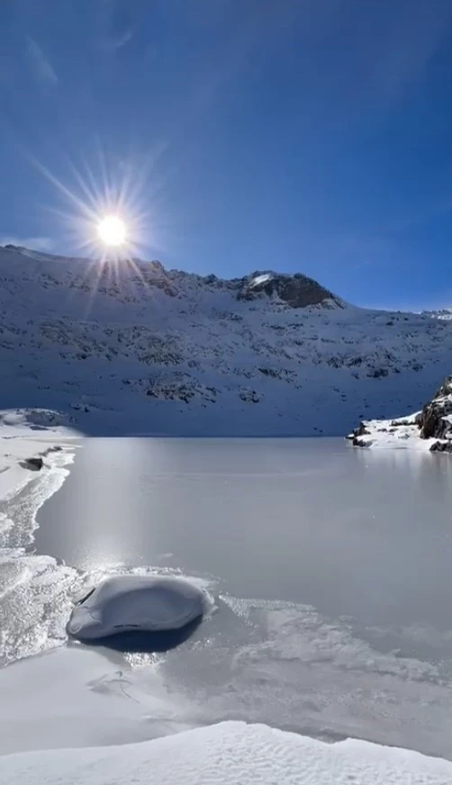 Bölgede kar yağışının başlamasıyla birlikte yolu kapanan tabiat parkına ulaşan 3 adrenalin tutkunu gezgin, karla kaplanan zirveleri ve donan gölleri görüntüleyerek doğanın kış güzelliğini kayıt altına aldı.