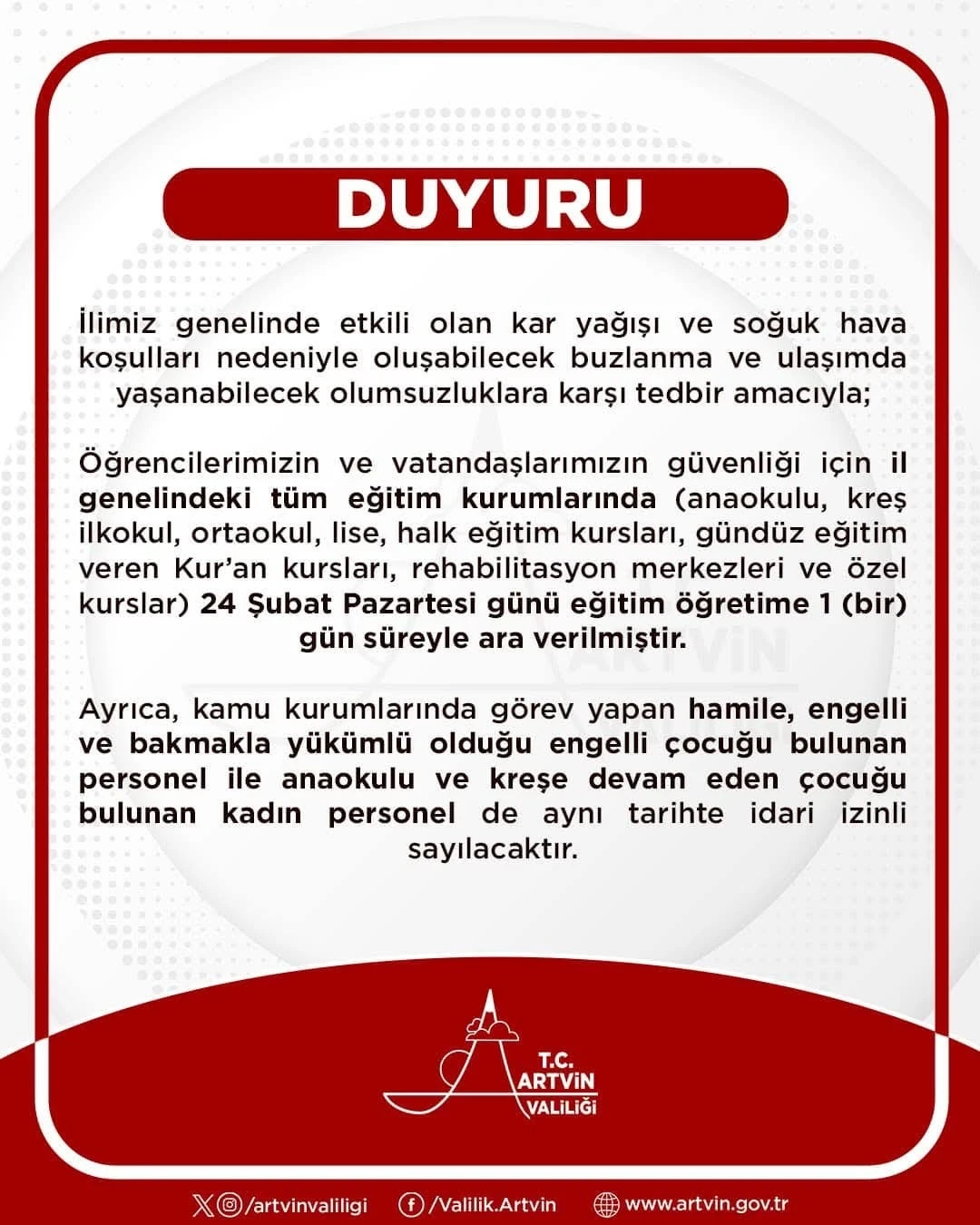Artvin genelinde kar yağışı nedeniyle ulaşımda yaşanabilecek olumsuzluklara karşı tüm eğitim kurumlarında 24 Şubat Pazartesi günü eğitime 1 gün ara verildi.