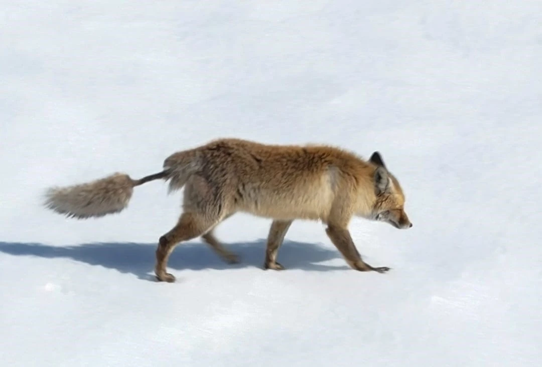 Artvin’in Şavşat ilçesindeki Sahara Geçidi bölgesinde av arayan bir kızıl tilki, havadan görüntülendi. İlginç bir şekilde, tilkinin kuyruğunun bir kısmında tüy bulunmazken, diğer kısmında ise kıvrılarak şekil alan tüyler, görüntüsü ile dikkat çekti.
