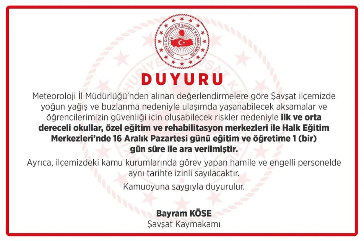 Olumsuz hava şartları nedeniyle Şavşat ve Yusufeli ilçelerinde 16 Aralık Pazartesi günü eğitime ara verildi. Şavşat Kaymakamlığı’ndan tapılan açıklamada, “İlçemizde devam eden olumsuz hava koşulları sonucunda ulaşımda yaşanabilecek aksamalar nedeniyle ilk ve orta dereceli okullar ile halk eğitim merkezinde 16 Aralık Pazartesi günü eğitim ve öğretime 1 gün süreyle ara verilmiştir. Ayrıca kamu kurumlarında görev yapan hamile ve engelli personel de aynı tarihte idari izinli sayılacaktır” ifadelerine yer verildi.