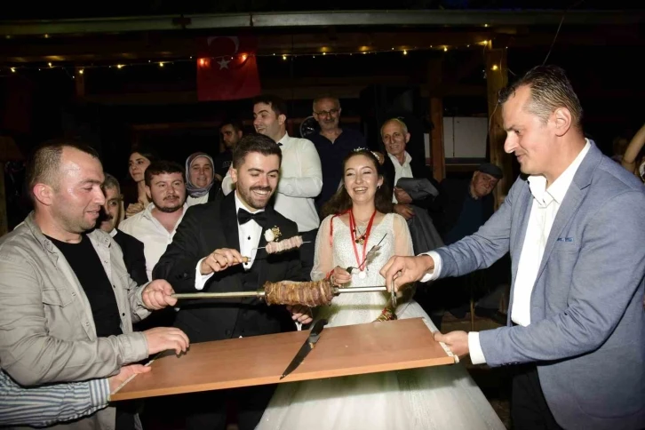 Artvin’de düzenlenen kır düğününde dünya evine giren gelinle damat düğün pastası yerine döner kesti. Davetlilere ise pasta yerine çağ kebap ikram edildi.