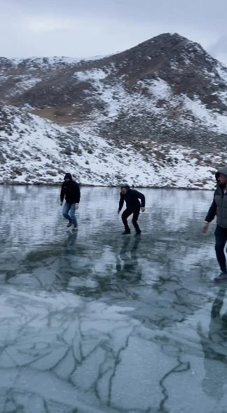 Hava sıcaklığının mevsim normallerinin altında seyretmesi nedeniyle göl yüzeyinde yaklaşık 35-40 santimetre kalınlığında buz tabakası oluştuğu belirtildi. Gençlerin buz üzerindeki renkli anları cep telefonu kamerasıyla kaydedildi.