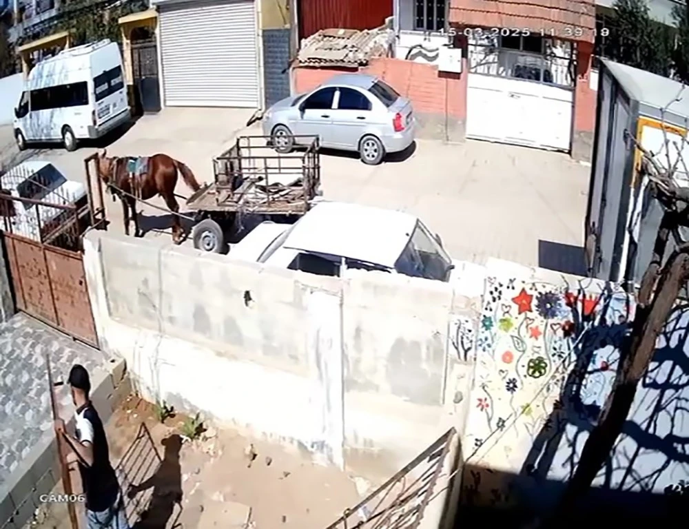 Hatay’ın Reyhanlı ilçesinde at arabasıyla gelen şahsın evin bahçesinde bulunan demir korkuluğu alarak uzaklaştığı anlar güvenlik kamerasına yansıdı.
