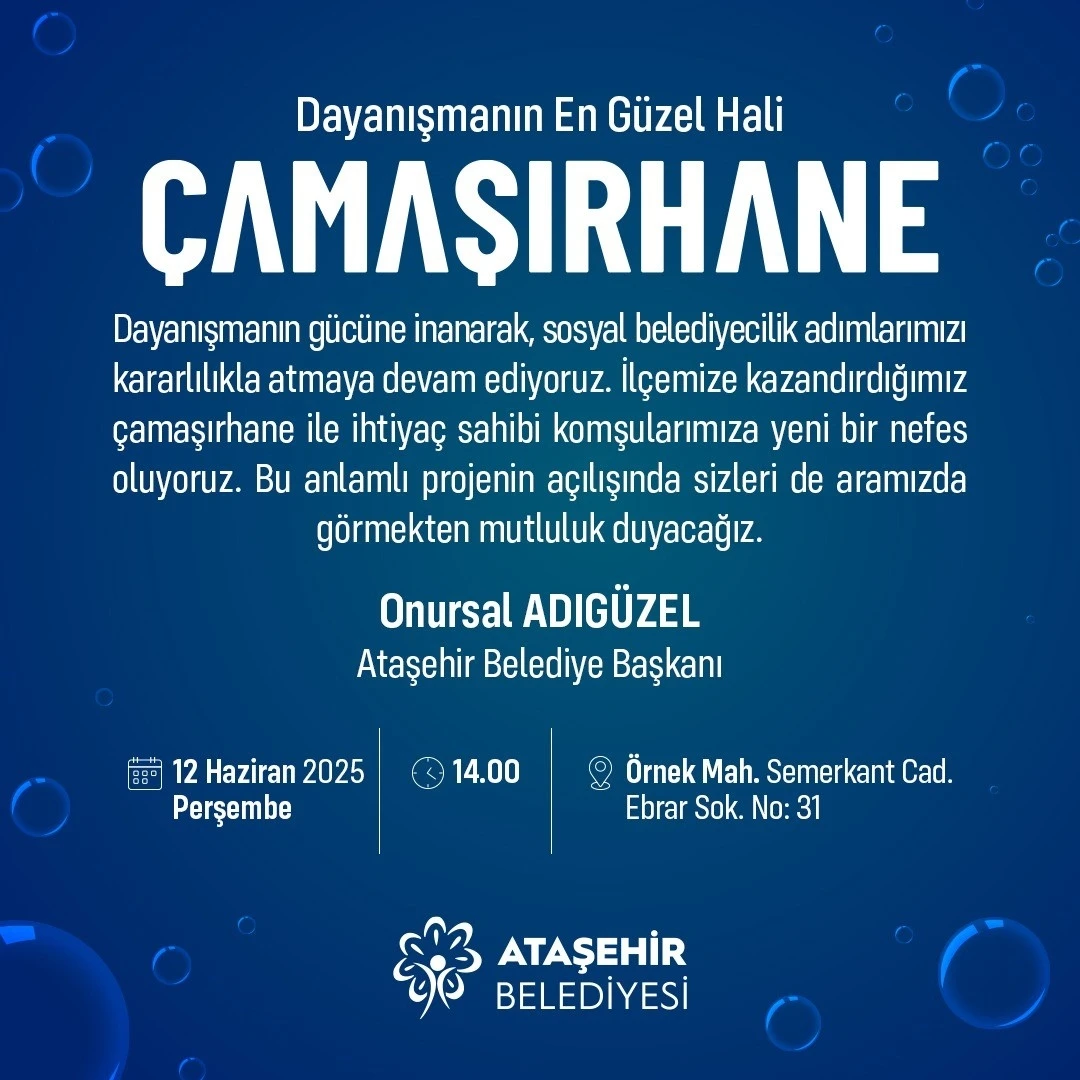 Ataşehir Belediyesi, ihtiyaç sahibi vatandaşlar ve ilçede yaşayan üniversite öğrencileri için ücretsiz "Çamaşırhane" hizmetini hayata geçirdi. Ataşehir Belediyesi, Çamaşırhane hizmeti ile ekonomik zorluklar yaşayan bireylerin hijyen ihtiyaçlarını karşılamalarına destek olacak. Temizliğin; sadece bir ihtiyaç değil, aynı zamanda insanca yaşamın temel haklarından biri olduğu fikrinden hareket eden Ataşehir Belediyesi, bu doğrultuda sosyal adaleti ve dayanışmayı güçlendirecek projeler üretmeye devam ediyor. İhtiyaç sahibi vatandaşların ve üniversite öğrencilerinin günlük yaşamını kolaylaştıracak ve sosyal dayanışmayı büyütecek yeni bir hizmeti daha hayata geçiren Ataşehir Belediyesi; hizmete aldığı çamaşırhaneyle hijyen şartlarına uygun, konforlu bir temizlik alanı sunuyor. Tam donanımlı 14 adet yıkama ve kurutma makineleriyle kurulan çamaşırhane, hizmetlerini ücretsiz olarak sağlayacak. Örnek Mahallesi Semerkant Caddesi Ebrar Sokak adresinde hizmet verecek çamaşırhanenin açılışı, 12 Haziran Perşembe günü saat 14.00’de yapılacak.