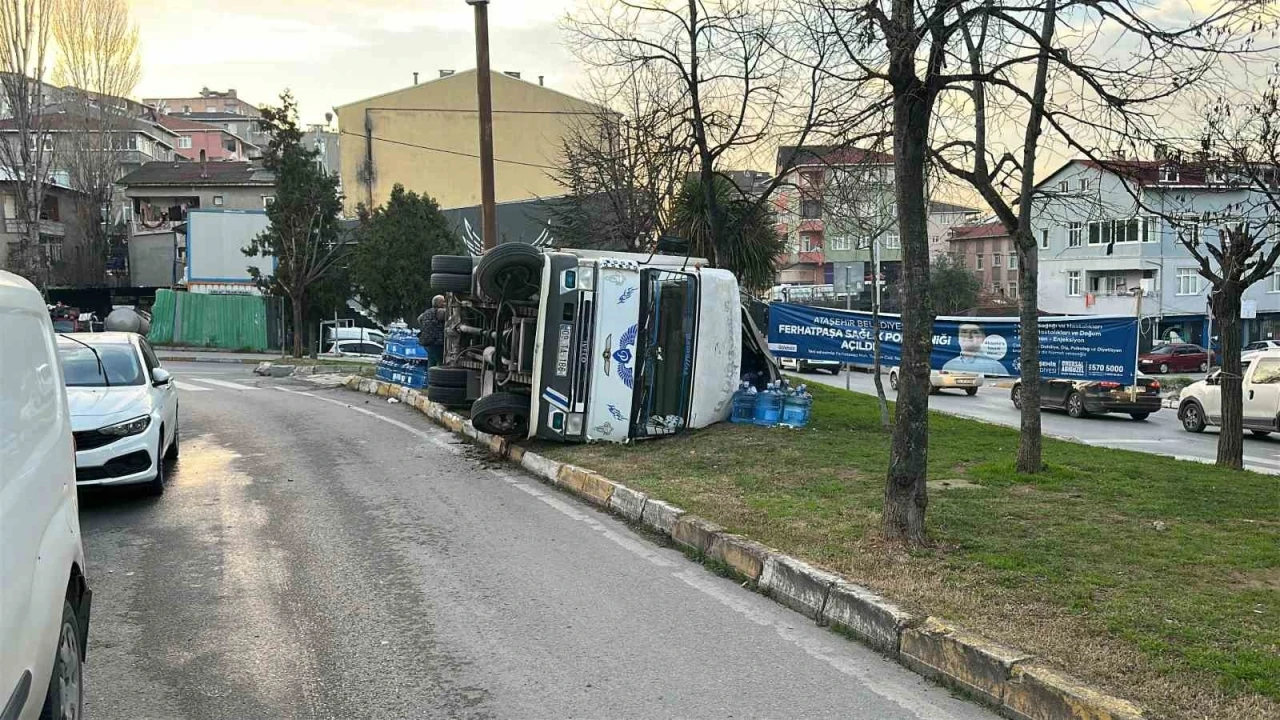 Ataşehir’de freni patlayan kamyonet yan yattı.