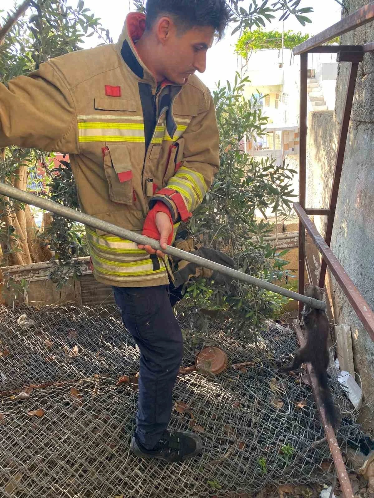 Hatay’ın İskenderun ilçesinde ava giden sansar, bir evin bahçesinde tellere takılarak mahsur kaldı.