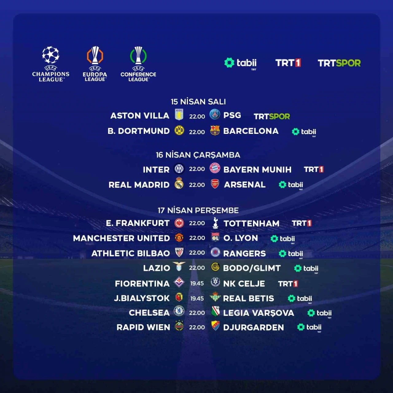 UEFA Şampiyonlar Ligi, Avrupa Ligi ve Konferans Ligi çeyrek final rövanş turunda, 15-17 Nisan tarihlerinde oynanacak 12 karşılaşma, TRT 1, TRT Spor ve tabii platformunda futbolseverlerle buluşacak.