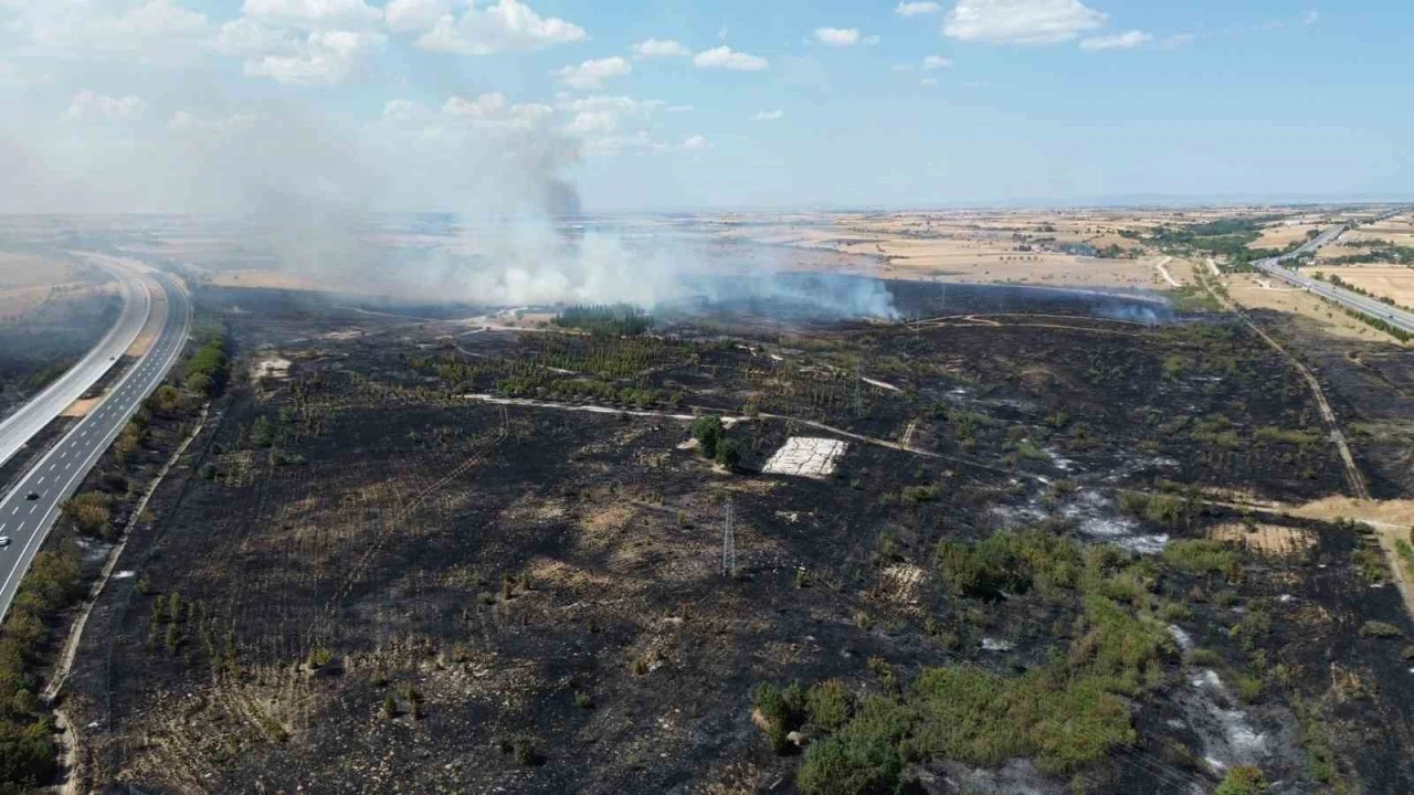 Kırklareli’nin Babaeski ilçesinde TEM Otoyolu çevresinde çıkan yangına havadan ve karadan müdahale ediliyor. Alevlerin boyutu ise drone ile böyle görüntülendi.