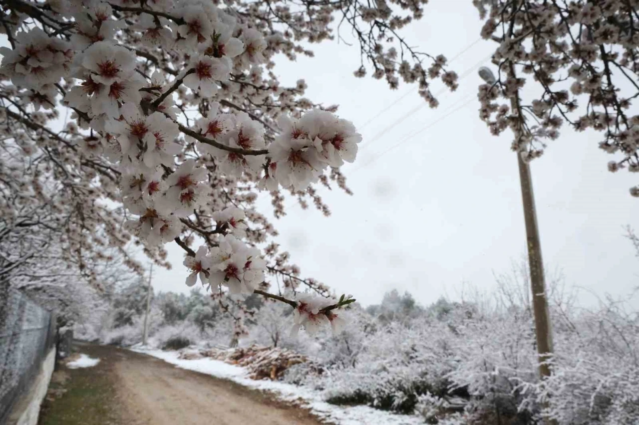 Meteorolojinin soğuk hava uyarısının ardından Muğla’nın Menteşe ilçesinde kar yağışı başladı. İlçenin yüksek kesimlerinde yer alan Göktepe mevkisinde sabah saatlerinde etkili olan kar yağışı, doğayı beyaza bürüdü. Bahar mevsimi ile beyaz çiçeklerine kavuşan ağaçlar, kar yağışı ile bir daha beyaza büründü.